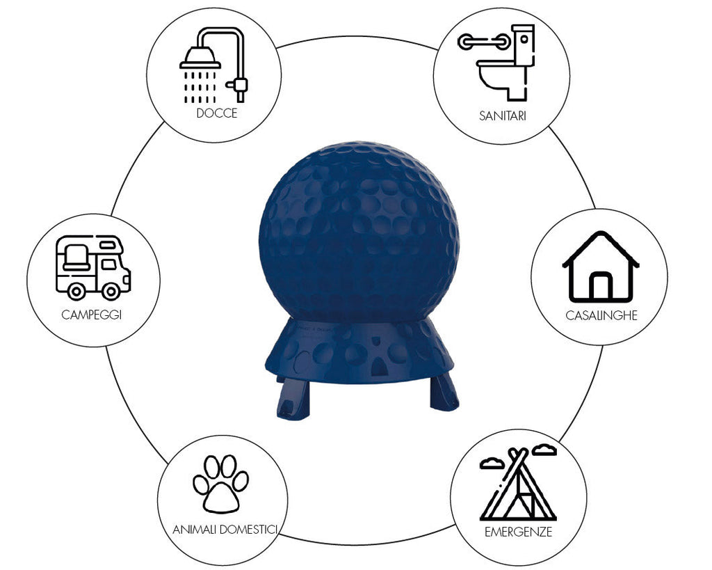 HOT BALL è un collettore solare per riscaldare l'acqua che usiamo all'aperto nella doccia in giardino, in un lavandino, erogatori d'acqua di vario tipo oppure per scaldare l'acqua in ogni occasione si renda necessaria, magari per la tinozza nella quale facciamo il bagno al nostro cane.