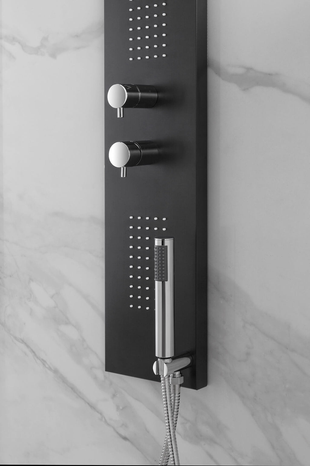 Duschsäule aus mattschwarzem Edelstahl mit drei wählbaren Funktionen: Handbrause, Kopfbrause, horizontaler Strahl.