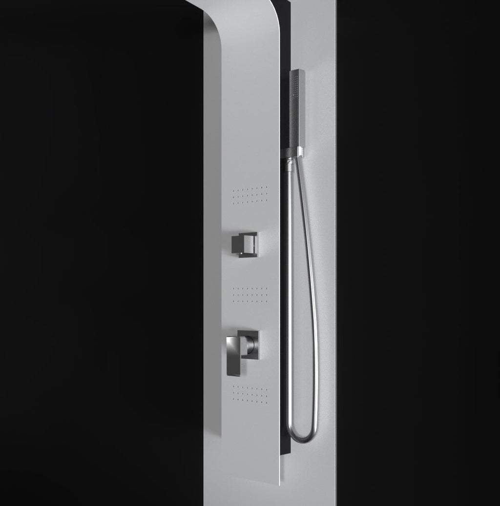 Hydromassagepaneel aus mattweiß (vorne) und mattschwarz (seitlich) lackiertem Aluminium mit Duschkopf und Hydromassagedüsen, die ideale Lösung für Duschliebhaber in totaler Entspannung.