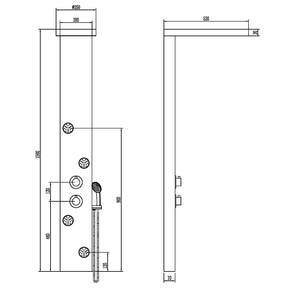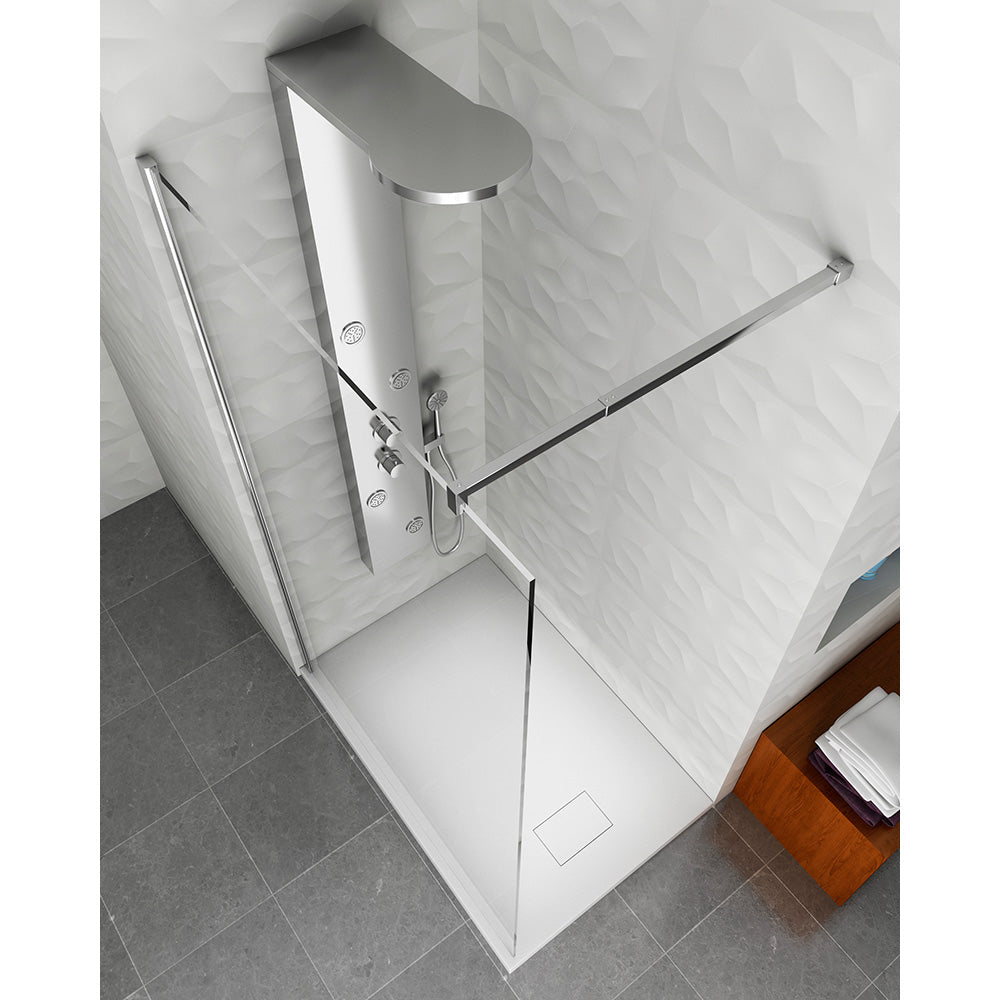 Der Körper des vorgeschlagenen Duschpaneels besteht aus Edelstahl mit gebürsteter Anti-Fingerabdruck-Oberfläche, der flexible Schlauch und die Handbrause sind im Lieferumfang enthalten, der 4-Wege-Mischer bietet die Möglichkeit, den Wasserstrahl individuell zu steuern auf: Duschkopf , Hand Dusche , Zervikalwasserfall und Hydromassagedüsen .