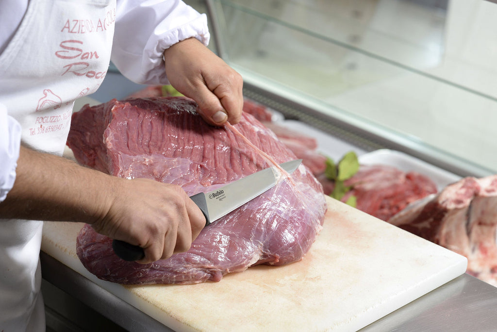 Das Scanno Straight Edge Bufalo Knife dringt perfekt ein, ohne das Gewebe zu beschädigen: Es ist perfekt für rohes Fleisch und zum präzisen Trennen des Fleisches vom Knochen.