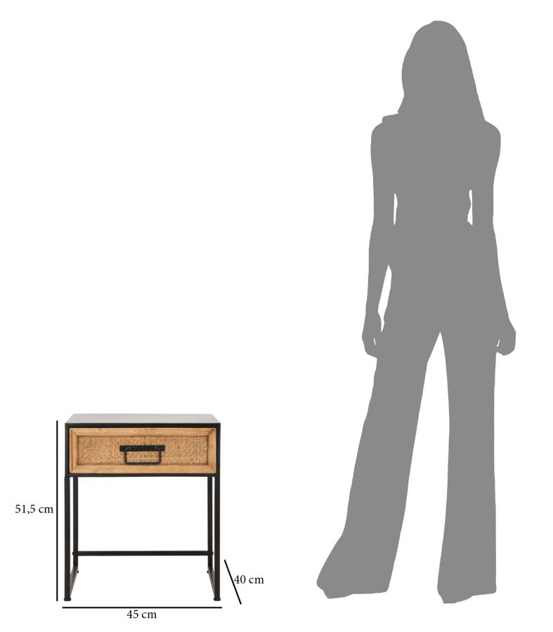 Nachttisch mit schwarzer Metallstruktur und Holzschublade mit einer Verarbeitung, die an das Flechten von Rattan erinnert. Das einfache und geradlinige Design macht es zu einem Artikel, der sich mit jeder Art von Möbeln kombinieren lässt.