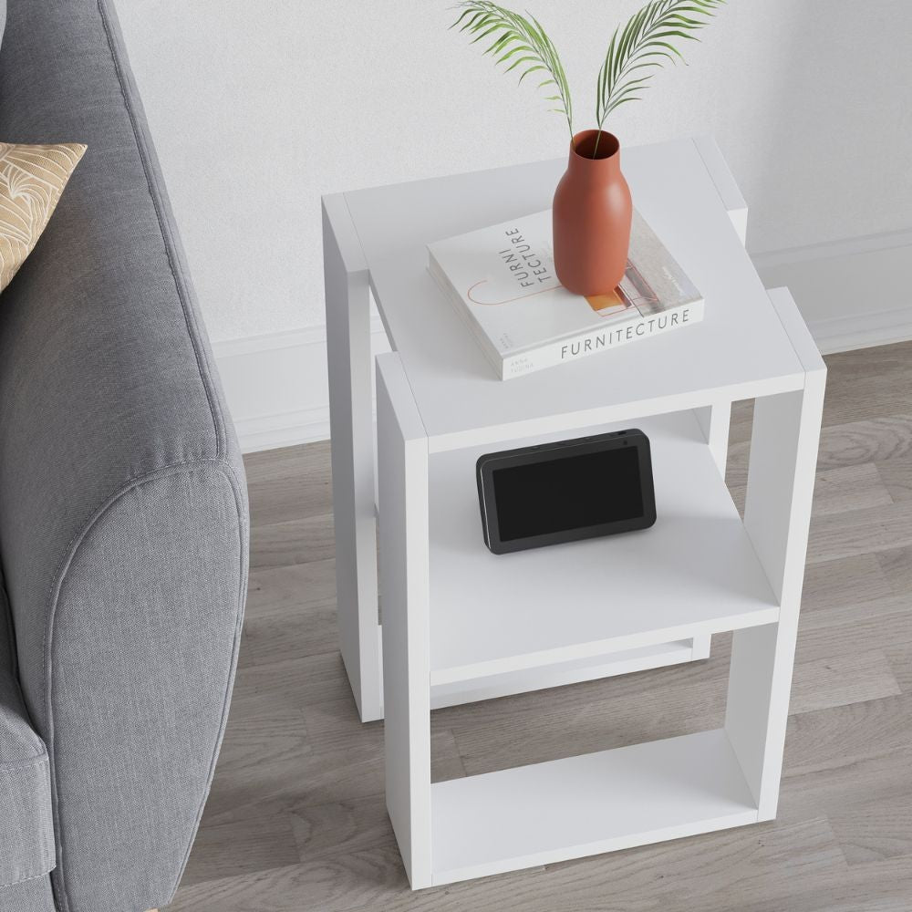 - Comodino versatile con colore bianco, 2 scomparti aperti e 1 ripiano