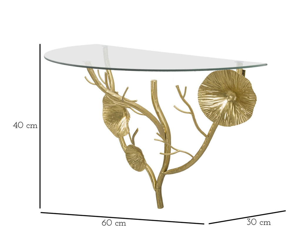Il comodino semicircolare da appendere è un elemento decorativo dal design elegante e raffinato. Realizzato in metallo dorato, è impreziosito da dettagli di rami e foglie che conferiscono un tocco naturale e luminoso. Il piano in vetro crea un contrasto armonioso con il metallo dorato, permettendo di visualizzare gli oggetti posti sul comodino con grazia. Questo elemento dallo stile unico diventerà sicuramente il punto focale di qualsiasi ambiente.