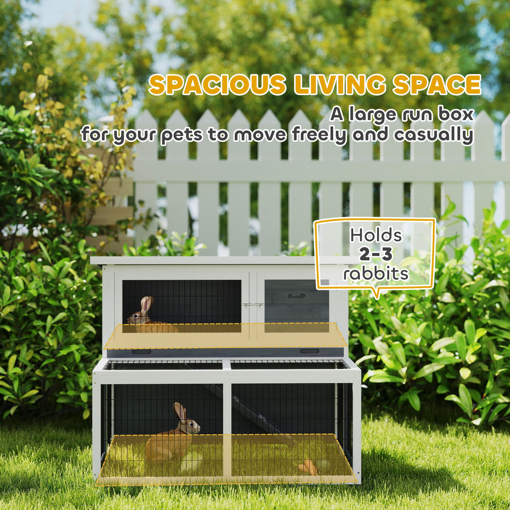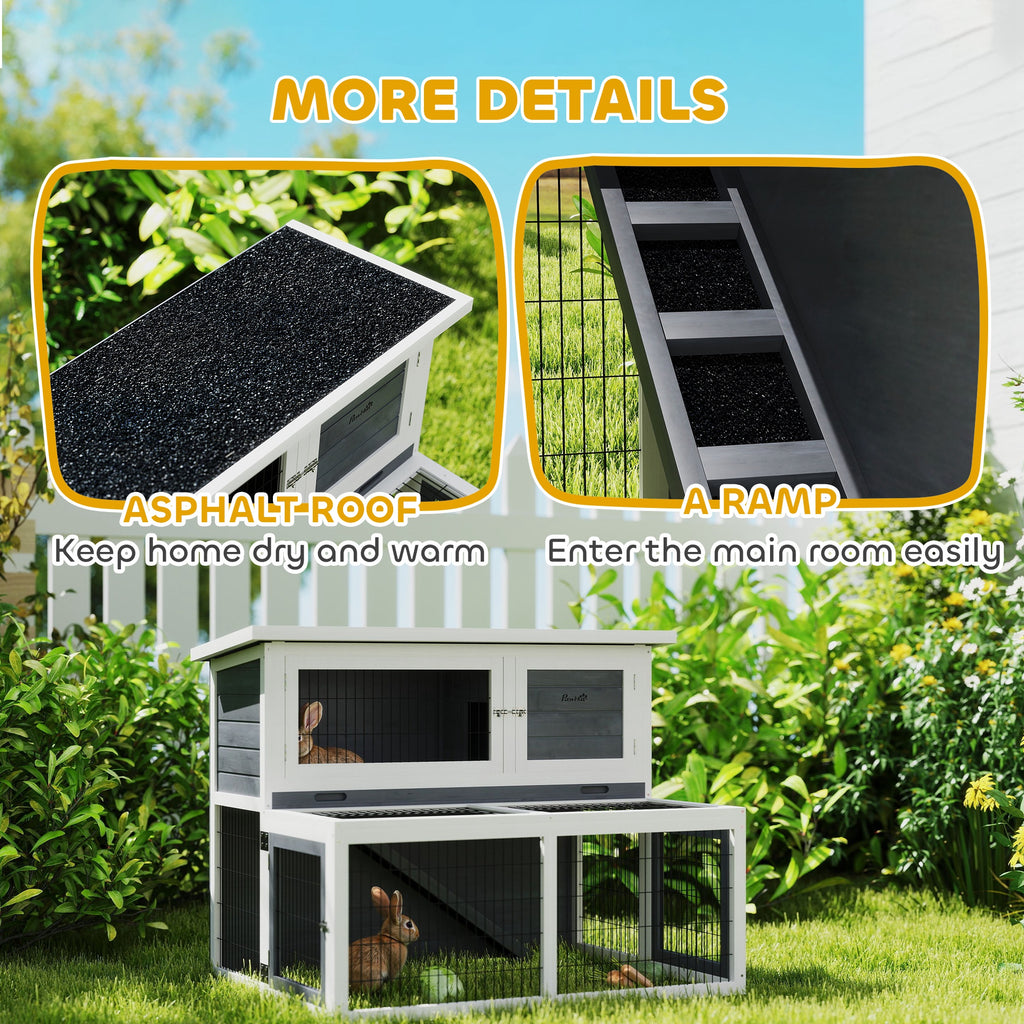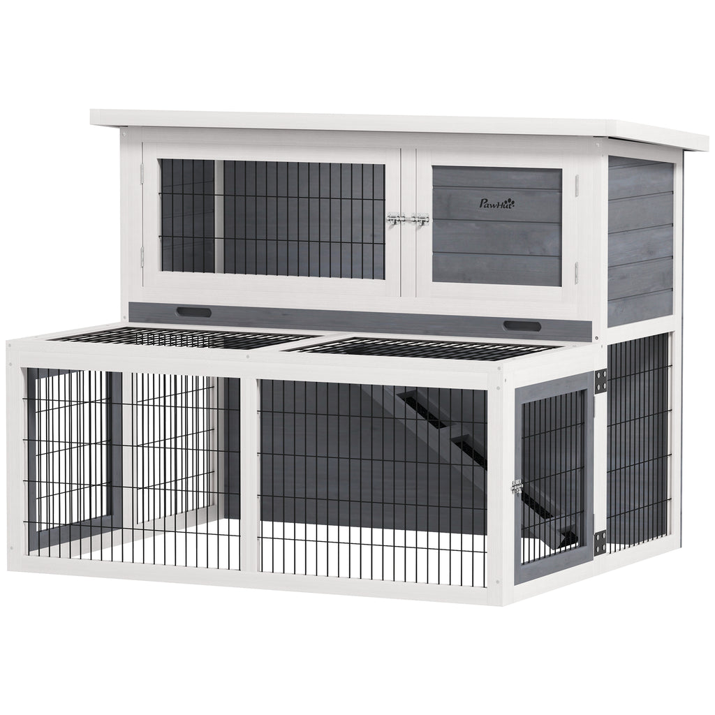 Conigliera a 2 Livelli 122x95x93,5 cm con Vassoio Estraibile in Legno di Abete e Acciaio Grigio e Bianco