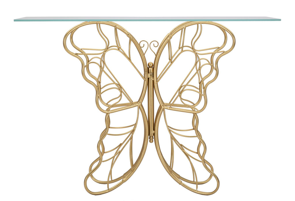 Originale goldene Metallkonsole mit Glasplatte. Die Metallbasis stellt einen Schmetterling mit offenen Flügeln dar, das symmetrische Design ermöglicht es, ihn in jedem Raum Ihres Hauses zu platzieren. Originelle und elegante Linien für einen glamourösen und starken Touch.
