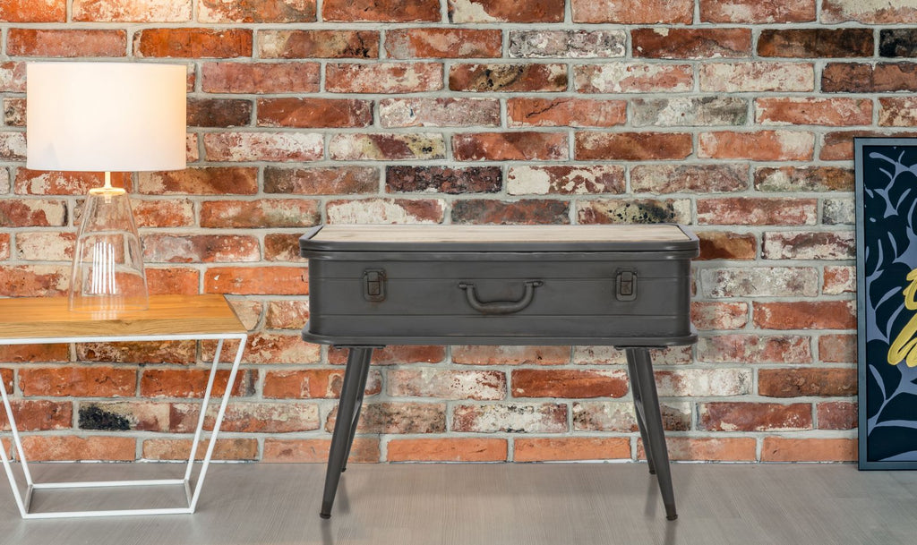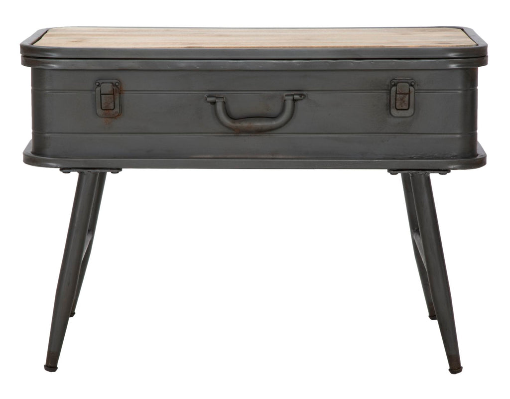 Konsole aus Metall und Holz mit Behälter für wahre Weltenbummler. Das Oberteil lässt sich komplett öffnen und wird zu einem großen Behälter. Ein einzigartiger Vintage-Stil, der dem Arbeits- oder Wohnzimmer Persönlichkeit verleiht.