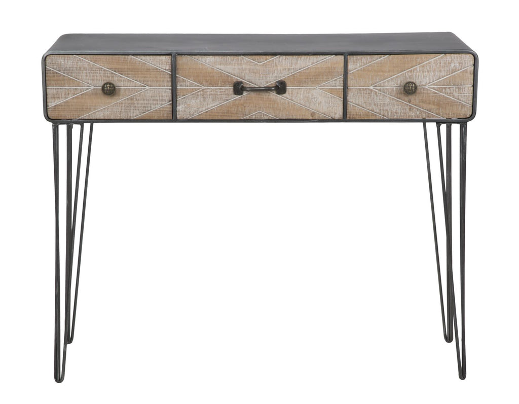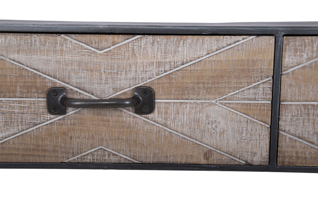 Konsole aus Eisen und MDF mit 3 Schubladen. Die Idee des industriellen Lofts entstand in den 70er Jahren unter den Künstlern von Metropolen wie New York, London und Paris, die mit überraschenden und beispiellosen Ergebnissen ihr Atelier in ihr Zuhause verwandelten. Die Möbel und Bücherregale der Linie Soho schaffen sofort eine gesellige und ungezwungene Atmosphäre. Sie verleihen Charakter durch Materialien von großem optischen Gewicht wie gebeiztes Holz und Eisen und zwinkern den Jahren der amerikanischen Prohibition entgegen.