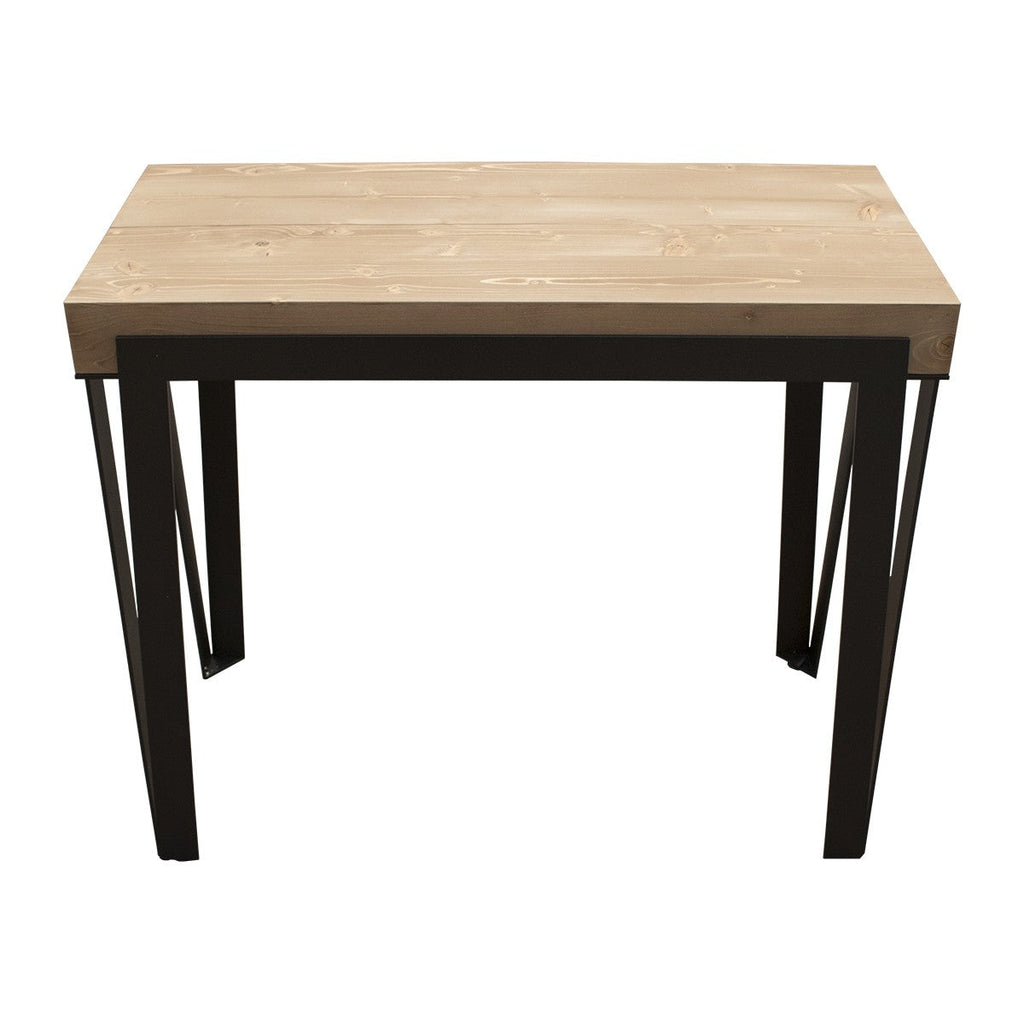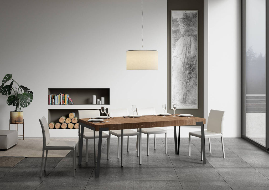 Consolle allungabile Dalia Small Premium, con piano e allunghe a Folding, elegante e al contempo divertente, particolarissima grazie al design delle gambe in metallo verniciato antracite, vero tratto distintivo della Consolle. La solidità della struttura in ferro tagliato al laser con il piano in legno listellare d'Abete rende la Consolle allungabile Dalia Small Premium, stabile e robusta. La Consolle è adatta sia per l'interno sia per l'esterno come bordo piscina, giardino e terrazzi. Made in Italy.