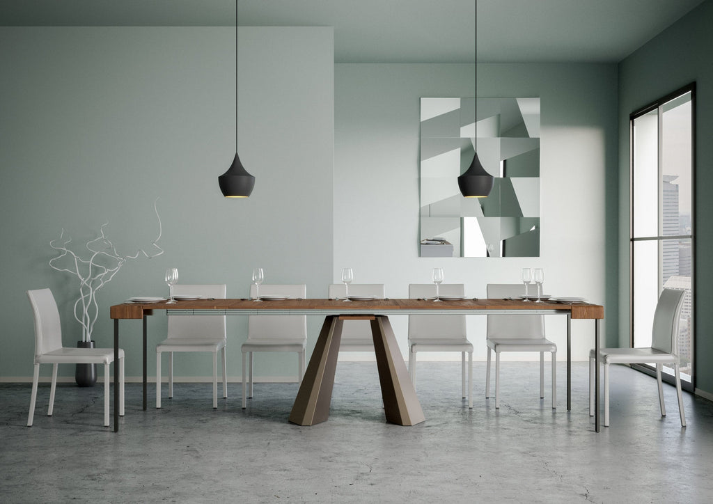 Consolle Diamante Art, un Tavolo Consolle ricercato per arredare con gusto e design la tua casa. La linea originale rende la Consolle perfettamente adattabile al mobilio di casa, che sia in stile classico o moderno. Ciò che contraddistingue la Consolle Diamante Art è la praticità con la quale sarà possibile trasformarla da semplice e lineare Consolle a comodo e utile tavolo da pranzo.La Consolle Diamante Art potrete collocarla in cucina, in sala da pranzo o in soggiorno, potrà essere interessante come punto di appoggio non appena si entra in casa se posta in ingresso e perché no, con sopra uno specchio e vicino a un vaso di fiori.La funzionalità e la versatilità la si riscontra proprio nella possibilità di allungare Consolle Diamante Art per ospitare amici e parenti nei momenti più importanti da condividere.Con il sistema di allunghe, in poche e semplici mosse trasformerete la piccola Consolle in un ampio tavolo da pranzo: stabile, resistente e robusto. La solidità della struttura il ferro con il piano lavorato a Folding, in Abete listellare, rende la Consolle robusta e stabile. Interamente made in Italy La Consolle di serie viene fornita con un sostegno centrale a due appoggiaterra che ne garantisce la propria funzionalità.