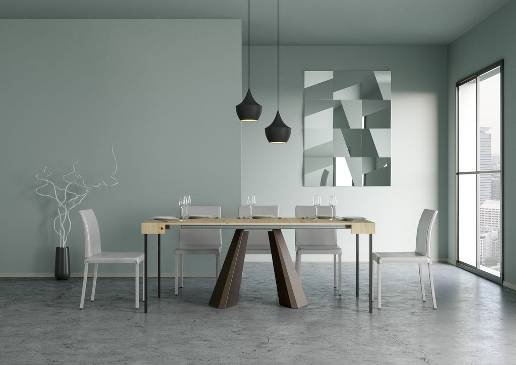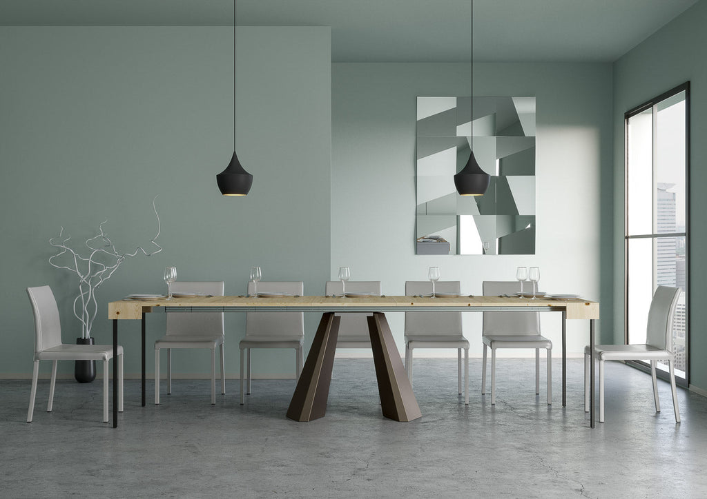 Consolle Diamante, un Tavolo Consolle ricercato per arredare con gusto e design la tua casa. La linea originale rende la Consolle perfettamente adattabile al mobilio di casa, che sia in stile classico o moderno.Ciò che contraddistingue la Consolle Diamante è la praticità con la quale sarà possibile trasformarla da semplice e lineare Consolle a comodo e utile tavolo da pranzo.La Consolle Diamante potrete collocarla in cucina, in sala da pranzo o in soggiorno, potrà essere interessante come punto di appoggio non appena si entra in casa se posta in ingresso e perché no, con sopra uno specchio e vicino a un vaso di fiori.La funzionalità e la versatilità la si riscontra proprio nella possibilità di allungare Consolle Diamante per ospitare amici e parenti nei momenti più importanti da condividere.Con il sistema di allunghe, in poche e semplici mosse trasformerete la piccola Consolle in un ampio tavolo da pranzo: stabile, resistente e robusto. La solidità della struttura il ferro con il piano lavorato a Folding, in Abete listellare, rende la Consolle robusta e stabile. Interamente made in Italy La Consolle di serie viene fornita con un sostegno centrale a due appoggiaterra che ne garantisce la propria funzionalità.