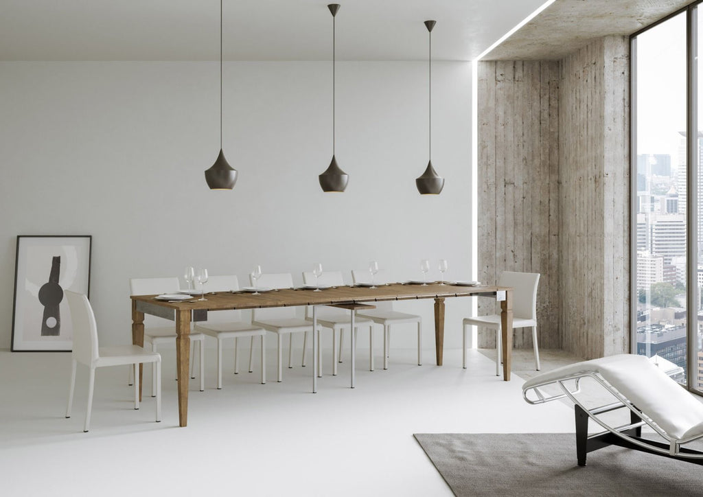 La Consolle Allungabile Impero Iron è una variante della Consolle Impero classica. Prende il nome dalla struttura sottopiano in ferro che dona a questa Consolle un fascino nuovo e moderno. Può essere posizionata molto bene anche in un arredamento moderno.Il connubio tra metallo e legno rende la console oltre che bella da vedere, anche resistente per i più svariati utilizzi. Le gambe della Consolle Impero Iron sono realizzate in legno massello mentre il piano e le allunghe sono pannelli di microparticelle di legno con utilizzo di collanti privi di formaldeide. Telaio in ferro verniciato.Made in Italy. La Consolle Impero Iron è dotata di 5 prolunghe. Tali prolunghe consentono di allungare la Consolle fino a cm 300 e ospitare quanti più amici avete voglia di invitare a casa vostra.Le prolunghe di serie misurano da 52 x 90 cm cadauna e sono comprese nel prezzo. Con questo sistema avrete la possibilità di regolare la lunghezza della Consolle sempre in base alle esigenze del momento. La stabilità della Consolle Impero Iron, quando completamente allungata, è garantita dal sistema di supporto centrale a 2 appoggiaterra.Tale supporto è incluso nel prezzo.