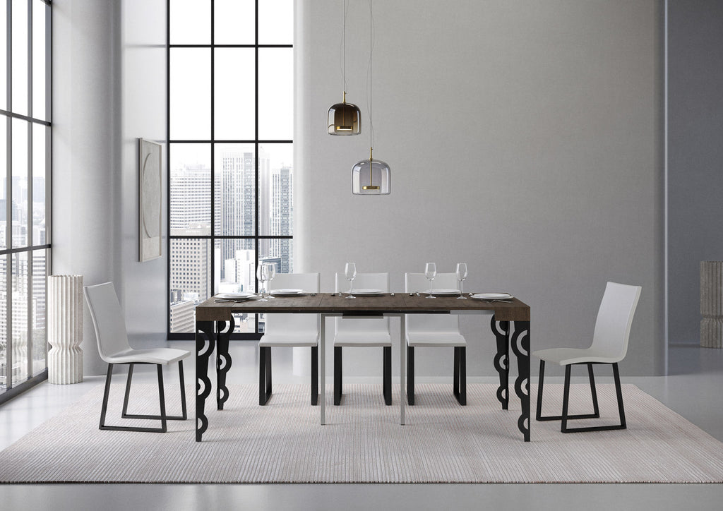 Karamay, una Consolle allungabile fino a 3 metri con 5 allunghe dallo stile inconfondibile grazie alla linea morbida delle sue gambe. Un modello capace di donare carattere a qualunque tipo di ambiente. Compatta e maneggevole, può essere inserita in un ingresso, corridoio, ingresso, soggiorno, studio o camera da letto. Grazie al sistema a cinque allunghe si estende progressivamente fino a 300 cm, trasformandosi in uno spazioso tavolo da pranzo in grado di ospitare fino a 14 persone. Una Consolle dalle infinite possibilità di utilizzo. Le allunghe sono nella stessa finitura del piano. Il robusto telaio in metallo lavorato a laser ad alta precisione, costituisce la struttura portante della Consolle stessa, garantendo stabilità e affidabilità anche alla sua massima estensione. Il telaio in ferro è disponibile nella versione verniciata. Realizzata interamente in Italia mediante l'utilizzo di materiali 100% italiani. Dimensioni L.90 P.40 H.77 (allungabile fino a 300 cm)