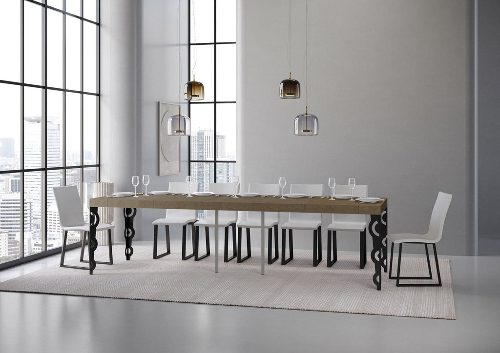 Consolle allungabile Karamay Premium, versatile e robusta, un complemento perfetto per ogni ambiente della casa: ingresso, cucina, sala da pranzo, soggiorno o corridoio. La consolle allungabile Karamay Premium può essere facilmente trasformata in un ampio tavolo da pranzo lungo fino a 300 cm, in grado di ospitare 14 persone. Realizzata con pannelli in nobilitato, gambe in ferro. Il sistema di allunghe con guide telescopiche in alluminio e il sostegno centrale in dotazione rendono la consolle stabile e robusta. Una volta che la consolle è chiusa, le allunghe devono essere riposte altrove.