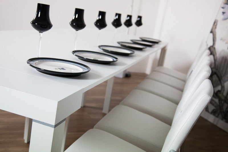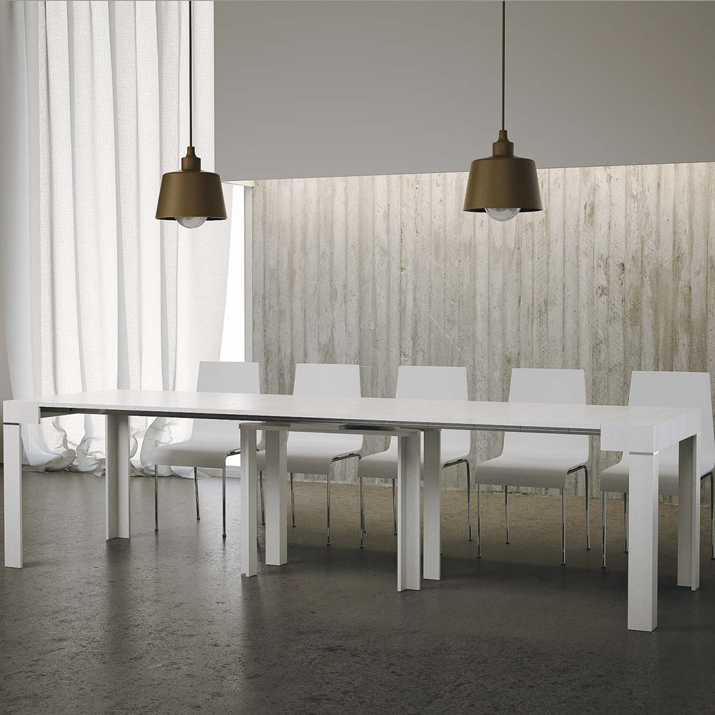 Eine Konsole, die sich mit wenigen Handgriffen in einen Tisch verwandelt, der verschiedene Größen von bis zu 3 Metern erreichen kann.