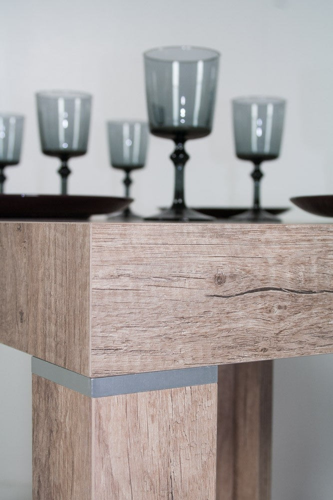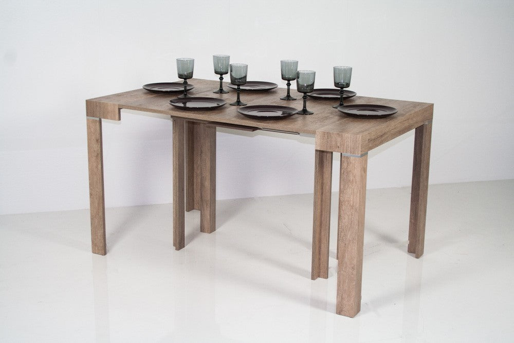Eine Konsole, die sich mit wenigen Handgriffen in einen Tisch verwandelt, der verschiedene Größen von bis zu 3 Metern erreichen kann.