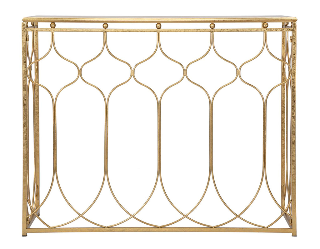 Rechteckige Konsole aus goldenem Metall. Die Linien beziehen sich auf arabische Architektur und Dekorationen, um jedem Wohnzimmer eine exotische, aber stilvolle Note zu verleihen.