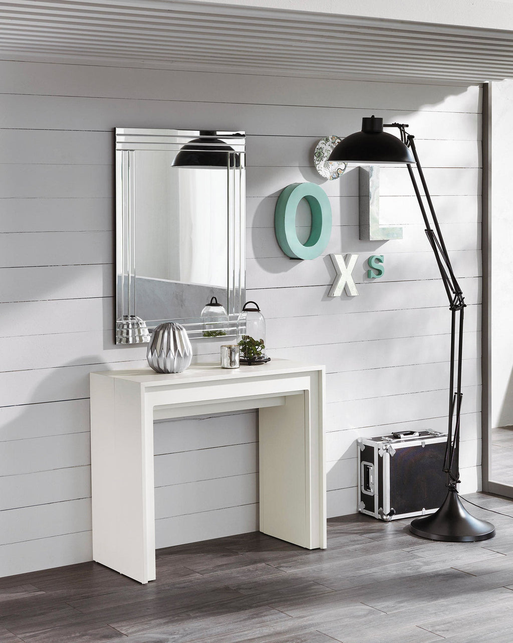 Ausziehbarer Konsolentisch der Serie "Pinocchio", kratzfest weiß mit 5 Auszügen à 52 cm.