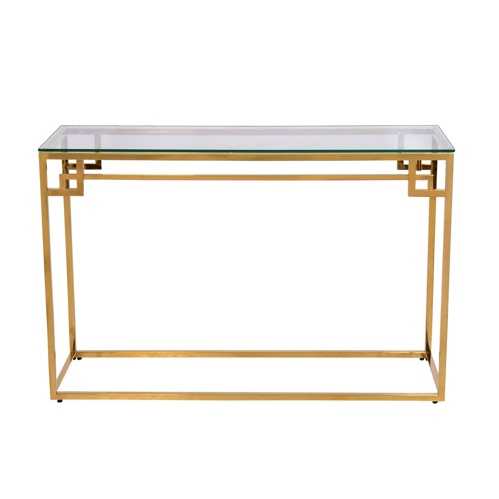 Consolle con finiture dorate in metallo e piano in vetro. Dimensioni 49 x 43.5 x 120 cm