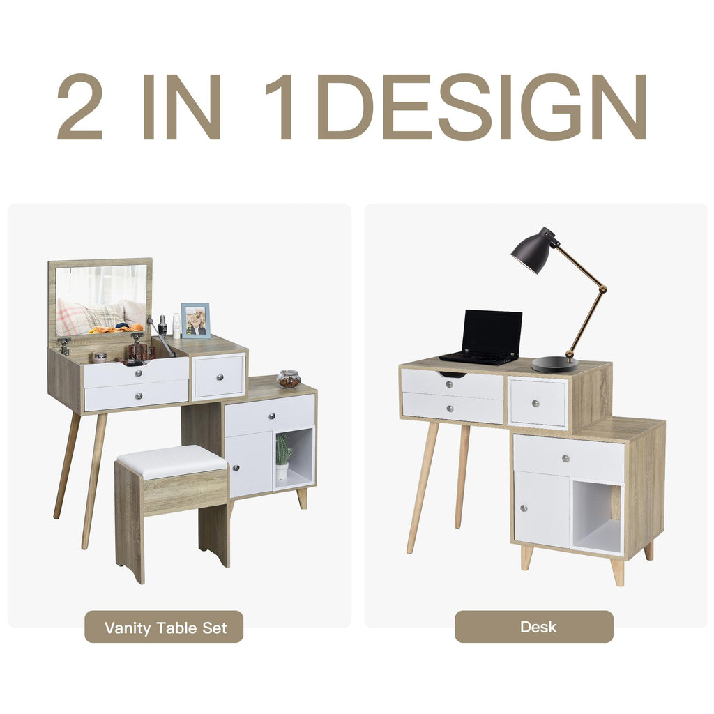 Dieser schicke Schminktisch mit Schiebespiegel und gepolstertem Hocker ist eine tolle Ergänzung für Ihr Schlafzimmer. Es verfügt über 3 Schubladen und 1 Türschrank mit einem verstellbaren Regal im Inneren und 1 offenen Regal, um Ihren Schmuck und Ihre Kosmetika in Ordnung zu halten. Der Hocker ist mit einem Kissen ausgestattet, das ihn bequem macht. Der Tisch besteht aus Spanplatten und die Beine sind aus Kiefernholz für zusätzliche Stabilität. Dieses Schminktisch-Set ist elegant und für jede Raumdekoration geeignet.