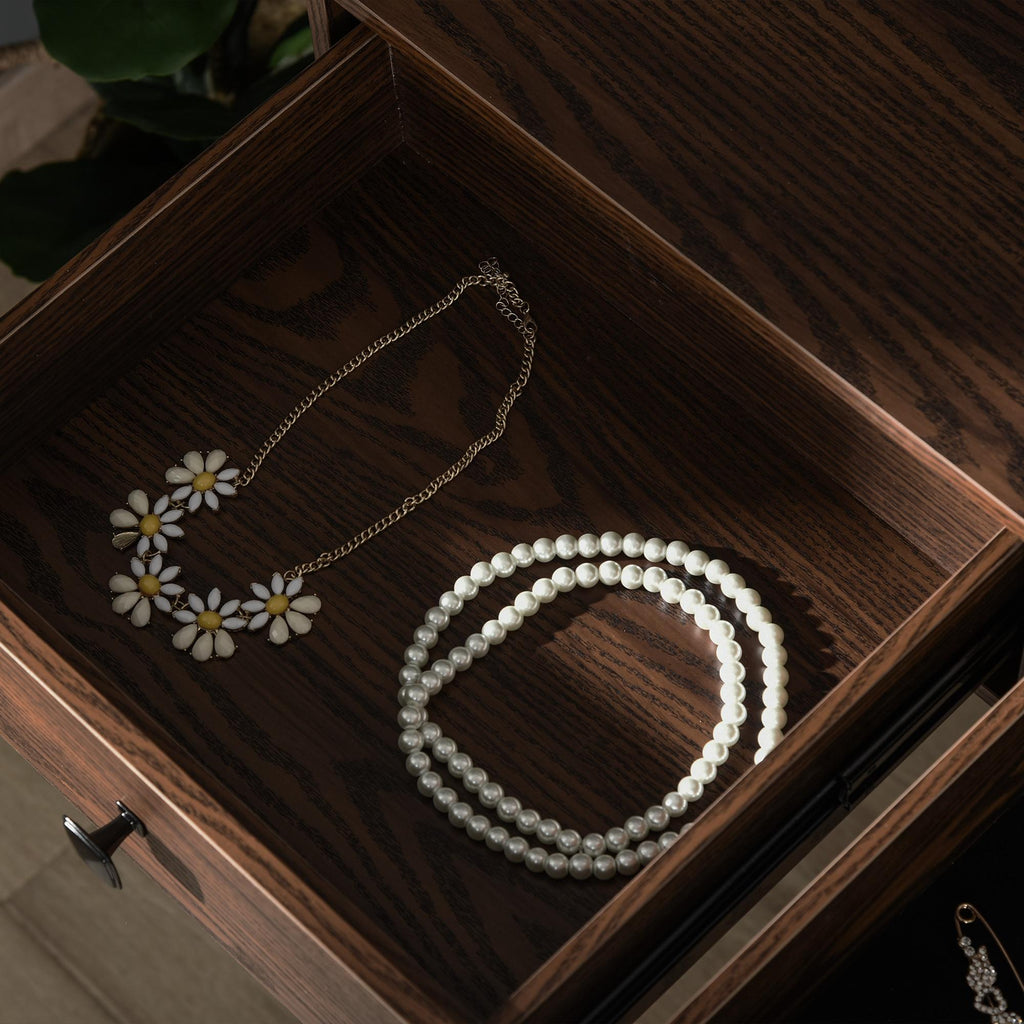 - FÜR ALLE IHRE MAKE-UPS: Dieser Schminktisch mit Spiegel hat 2 Schubladen, von denen eine Schlitze für Ringe hat. Auf dem Tisch befindet sich ein Ständer mit Fächern, in denen Sie Ihren Schmuck oder Ihr Make-up aufbewahren können