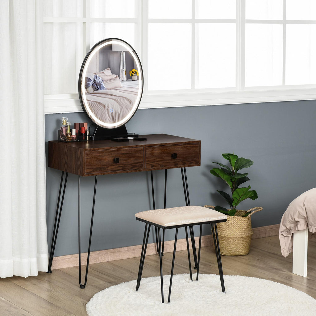Schminkkonsole 2 Schubladen 80x40x136 cm mit Spiegel und Nussholzhocker