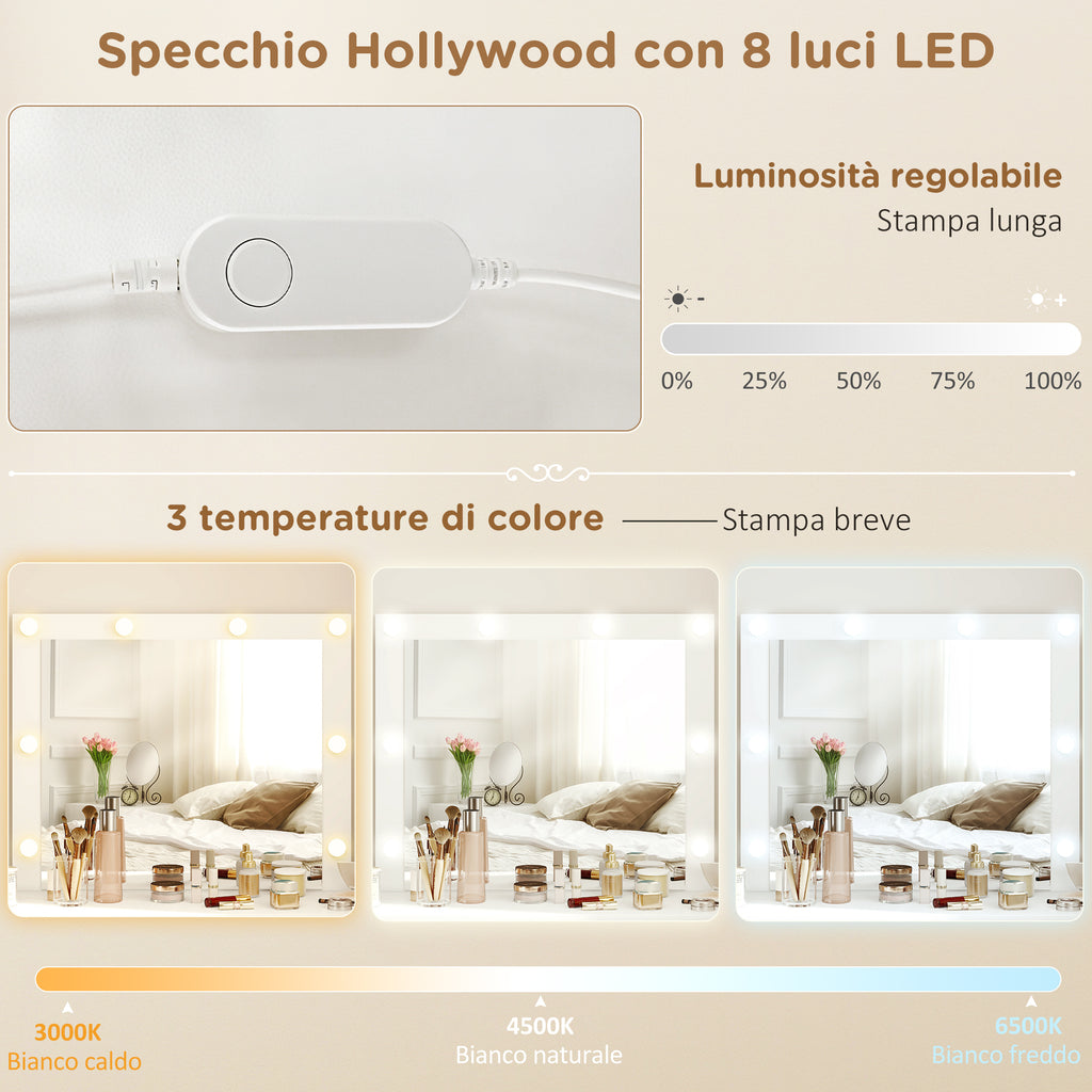 - SPECCHIO STILE HOLLYWOOD: Sentiti come una star grazie alle otto lampadine LED a luce soffusa su questo specchio da 64.4 x 57.2 cm. Tocca l'interruttore integrato per regolare la luminosità e passare da una luce bianca fredda a una calda o naturale
