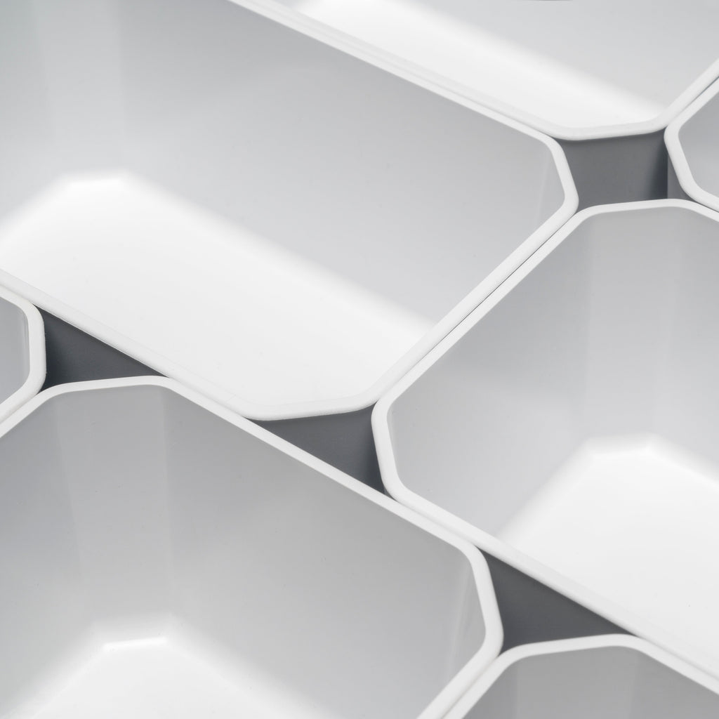 Vengono forniti 10 contenitori organizer per cassetti da bagno (4 contenitori grandi 100x150 mm e 6 contenitori piccoli 100x100 mm). Sono realizzati in plastica ABS, con un'elegante finitura grigio antracite o bianco, colori di tendenza nel design dell'arredo bagno, ideali da abbinare ai cassetti Emuca.