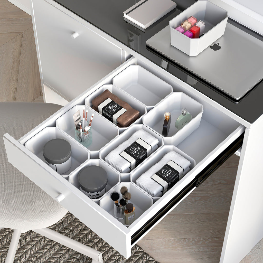I contenitori organizer sono progettati per tenere in ordine i cassetti del bagno, la loro funzione è quella di classificare e riporre i tuoi oggetti. Possono essere utilizzati insieme agli organizer, poiché sono progettati per poter posizionare i contenitori nei fori degli organizer laterali Tidy. Possono contenere un sacco di oggetti, sono facili da pulire e offrono un facile accesso agli accessori per il trucco, agli articoli da toeletta, ai gioielli, ecc.
