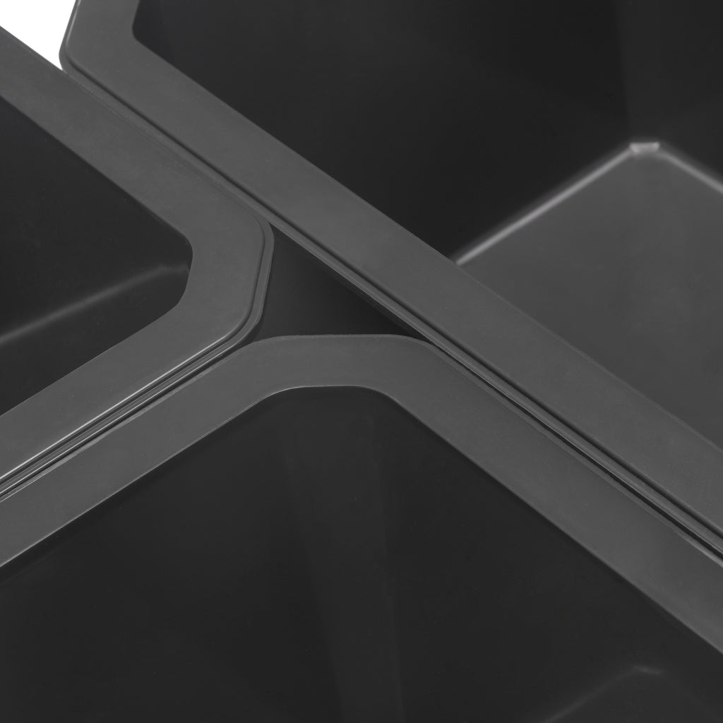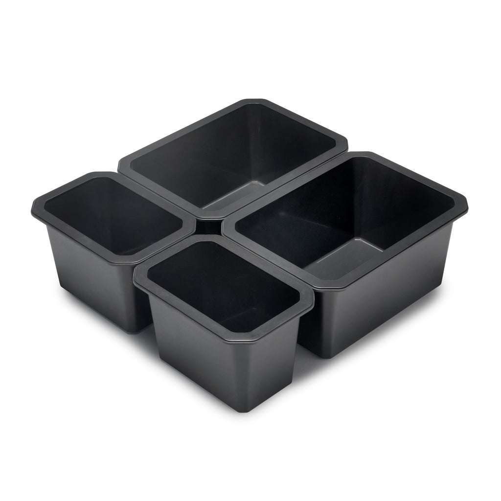 A seconda del modello selezionato, vengono forniti 4 contenitori organizer (2 contenitori grandi 220x300mm e 2 contenitori piccoli 220x150mm) oppure 6 comtenitori organizer (4 contenitori grandi 220x300mm e 2 contenitori piccoli 220x150mm). Sono realizzati in plastica ABS, con un'elegante finitura grigio antracite o bianco, colori di tendenza nel design dell'arredo bagno, ideali da abbinare ai cassetti Emuca.