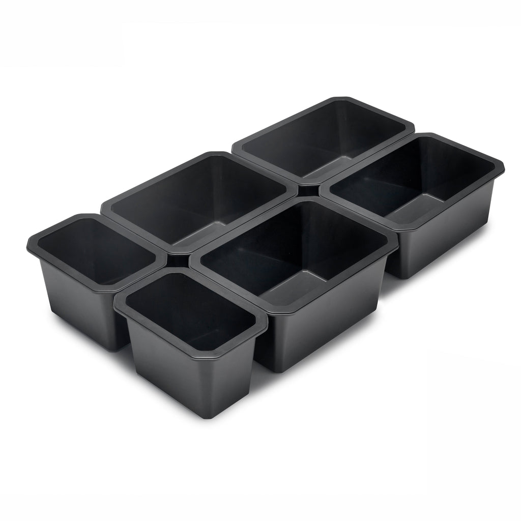 A seconda del modello selezionato, vengono forniti 4 contenitori organizer (2 contenitori grandi 220x300mm e 2 contenitori piccoli 220x150mm) oppure 6 comtenitori organizer (4 contenitori grandi 220x300mm e 2 contenitori piccoli 220x150mm). Sono realizzati in plastica ABS, con un'elegante finitura grigio antracite o bianco, colori di tendenza nel design dell'arredo bagno, ideali da abbinare ai cassetti Emuca.