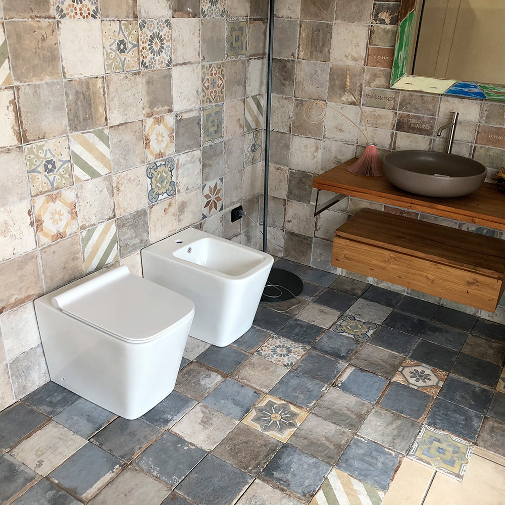 Schönes Paar Boden-Sanitärkeramik in quadratischer Ausführung! Schön, elegant und modern ist sie das Flaggschiff unseres Sanitärsortiments.