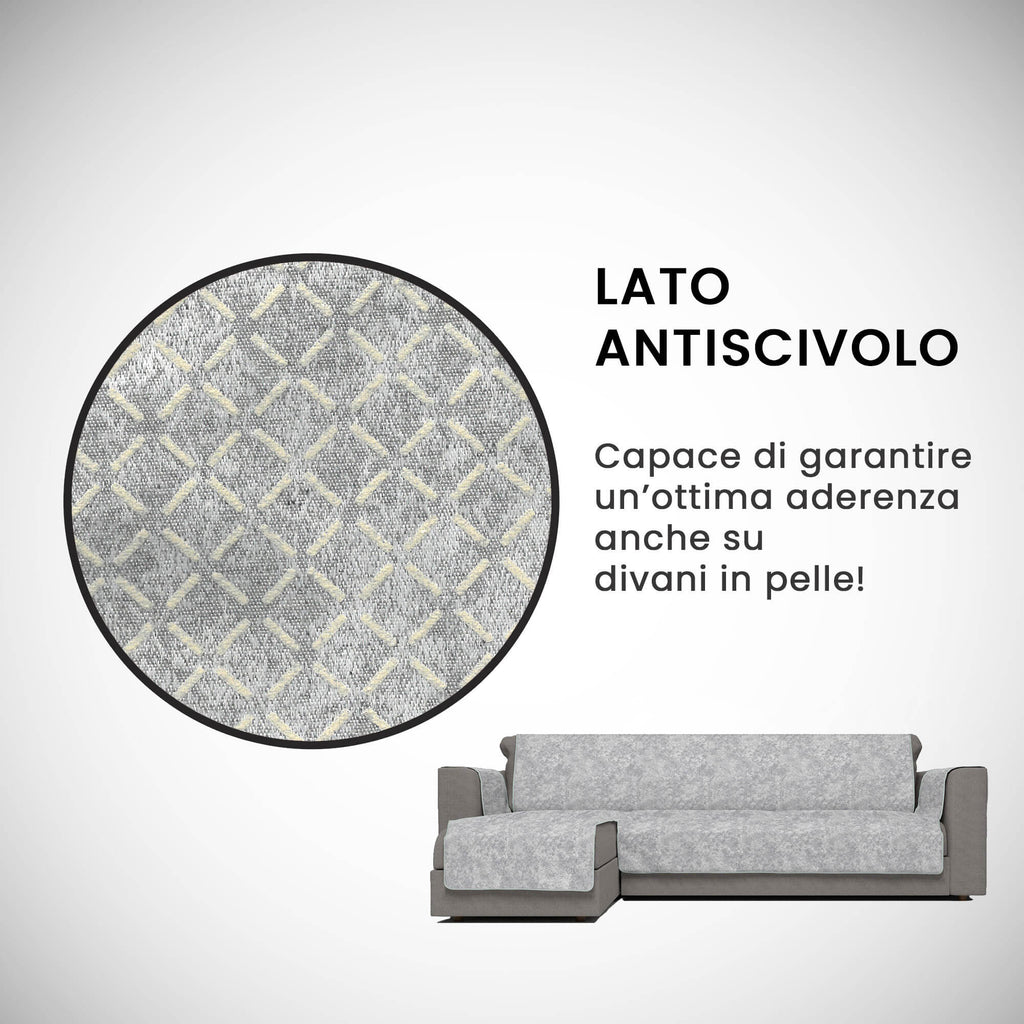 Sofabezug mit rutschfester Gummiunterseite, damit der Artikel perfekt auf dem Sofa haftet. Widerstandsfähig, anpassungsfähig an alle Arten von Sofas, insbesondere Ledersofas, wo normale Sofabezüge zum Verrutschen neigen. Artikel versehen mit Halbinsel links bei frontaler Betrachtung des Artikels. Artikel Hergestellt in Italien.
