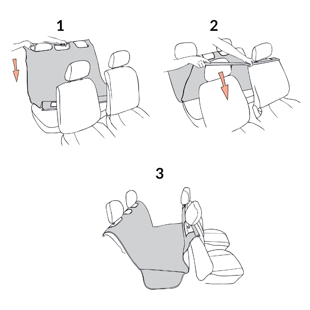 Vliesstoff für den Transport von Tieren auf der Rückbank. Die universelle Befestigung an den vorderen und hinteren Kopfstützen schafft eine Art Hängematte, die das Tier bei plötzlichem Bremsen schützt und gleichzeitig verhindert, dass sich die Tiere auf den Vordersitzen bewegen. Es schützt auch die Seite des Sitzes durch spezielle Klappen. Sehr praktisch, da es dank der innovativen Schnellkupplung schnell und einfach anzubringen und zu entfernen ist. Wenn es nur an den hinteren Kopfstützen befestigt wird, dient es als Rücksitzbezug. Es kann auch als Kofferraumschutz verwendet werden. Konzipiert für den Transport von kleinen und großen Tieren, ist es auch nützlich für den Transport von Gegenständen und Koffern.