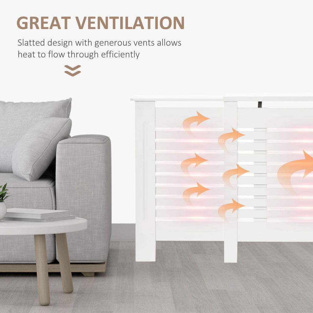 Machen Sie Ihren Heizkörper eleganter mit der Heizkörperabdeckung. Es ist aus stabilem 12 mm dickem MDF gebaut und hat eine einfache Linie, die sich perfekt an jede Umgebung anpasst. Das verstellbare Breitendesign ermöglicht es Ihnen, es an Ihre Bedürfnisse anzupassen. Die Lamellenplatte begünstigt den Durchgang von heißer Luft und die obere Ablage ermöglicht es Ihnen, beliebige Gegenstände zu platzieren. Darüber hinaus können Sie die Heizkörperabdeckung für zusätzliche Stabilität und als Kippschutz an der Wand befestigen.