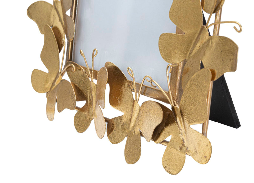 Eleganter Fotorahmen aus goldfarbenem Metall, verziert mit Schmetterlingen. Ein glamouröser Touch, der jedem Raum Helligkeit verleiht.