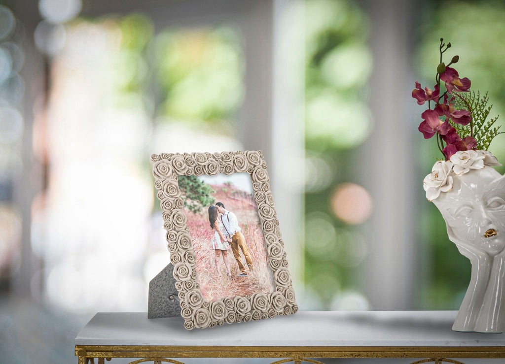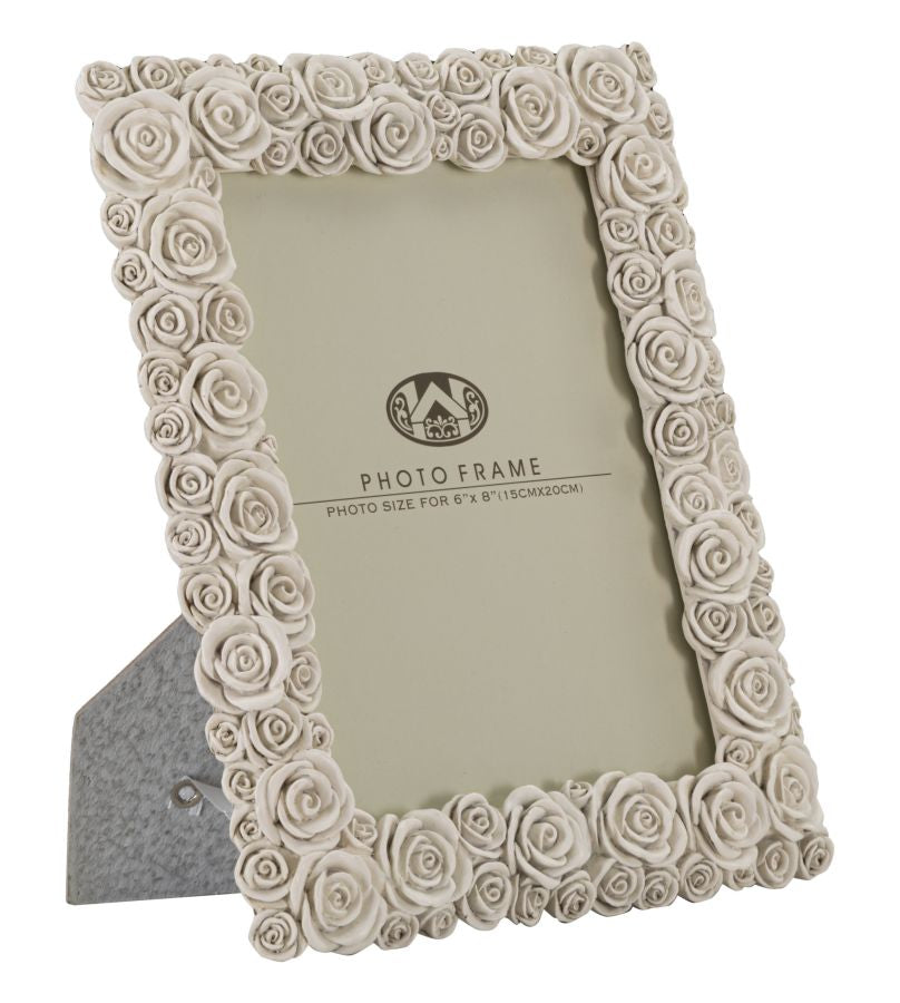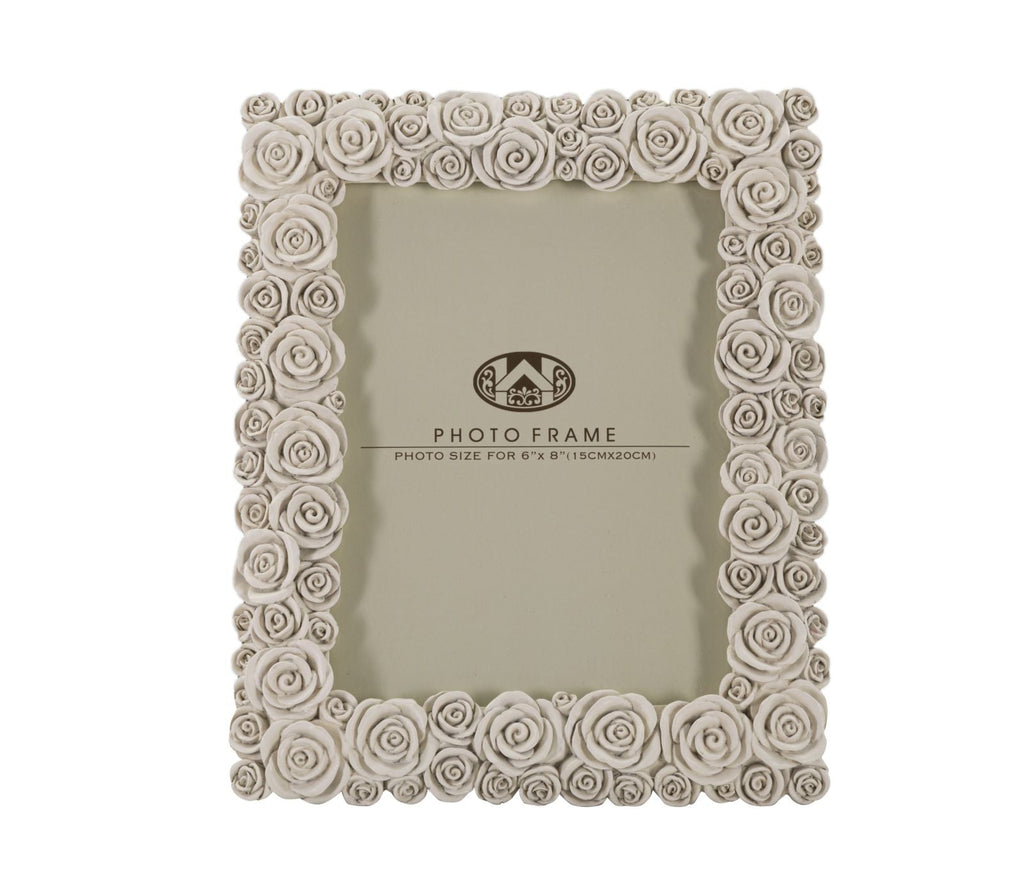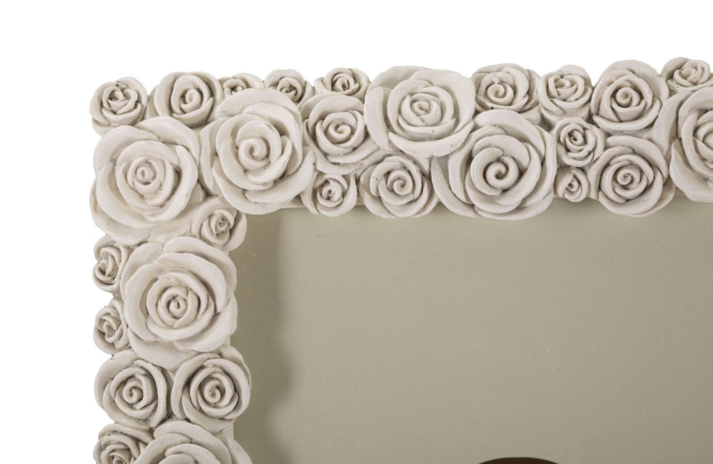 Questo elegante portafoto si distingue per la sua cornice delicatamente decorata con graziose roselline. Le dimensioni di 15x20 cm lo rendono adatto per contenere fotografie di dimensioni standard, permettendo di esporre i ricordi più amati in modo raffinato ed elegante. La cornice ornata con queste graziose roselline conferisce un tocco di grazia e romanticismo all'ambiente in cui viene posizionato, rendendolo un ottimo regalo per ogni occasione speciale.