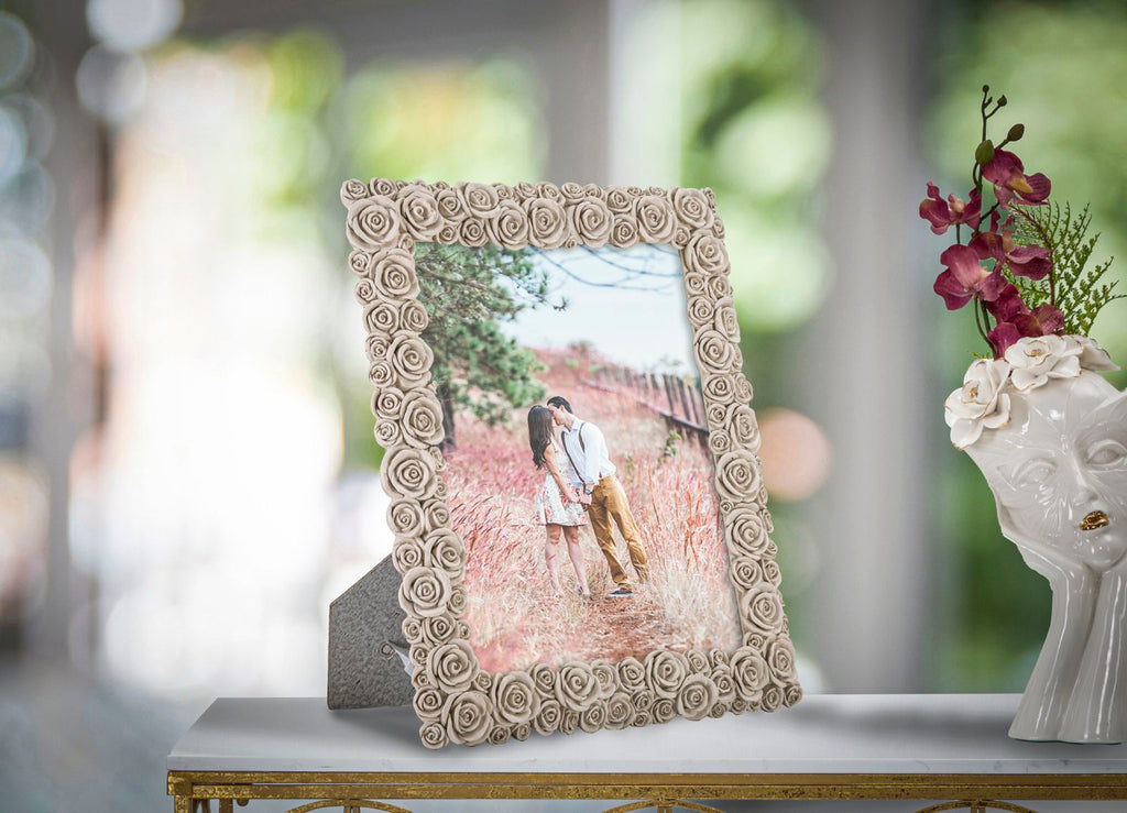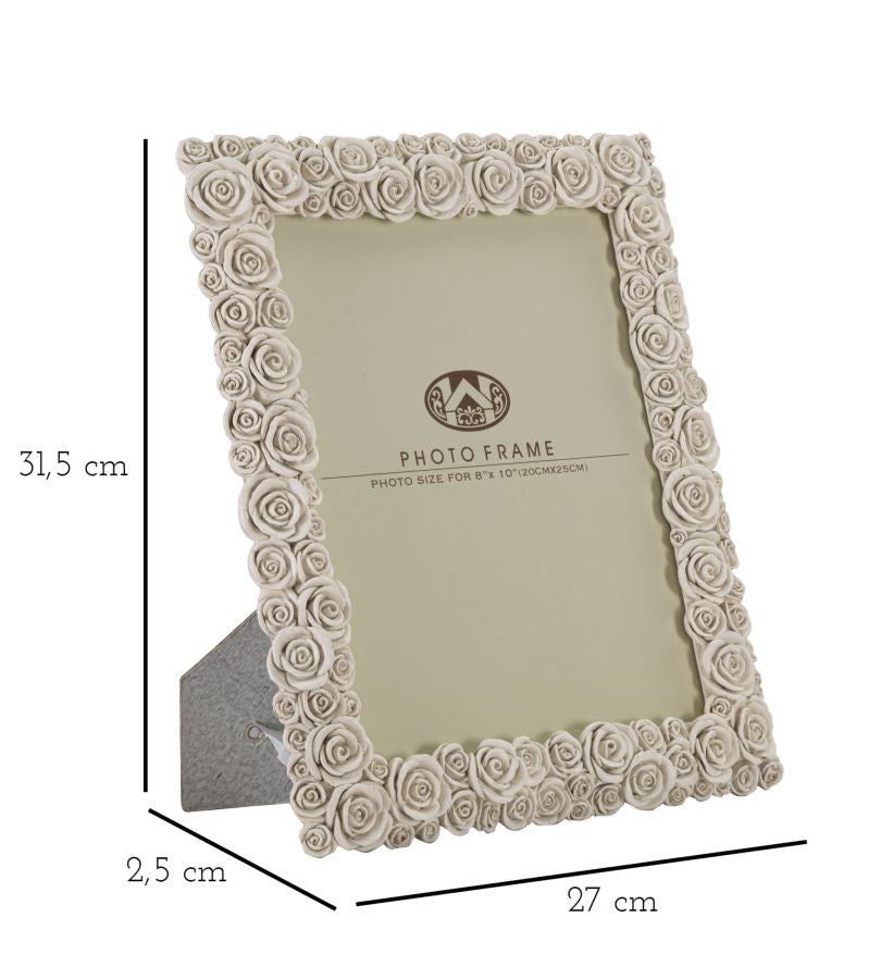 Questo elegante portafoto è caratterizzato da una cornice decorata con graziose roselline, che conferiscono un tocco delicato ed elegante. Il formato adatto per l'inserimento della foto è di 20x25 centimetri, garantendo così una perfetta esposizione dell'immagine. Ideale per regalare o abbellire la propria casa, questo portafoto dona un tocco di charme e raffinatezza ad ogni ambiente.