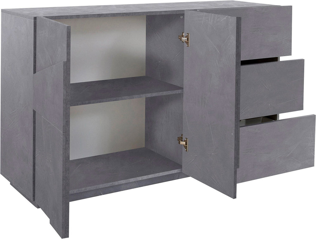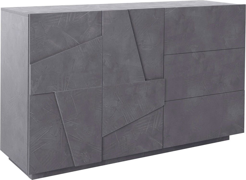 La credenza PING da 140 cm ha una struttura robusta e resistente di costituita da due sezioni contenitive. Sulla sinistra è presente un ampio vano con mensola centrale e 2 ante con chiusura a battente, in cui si possono riporre anche oggetti voluminosi in modo ordinato. Le ante presentano frontali con rilievo geometrico. Sulla destra del mobile, invece, si trovano 3 cassetti scorrevoli con sistema push-to-openper tessili vari.