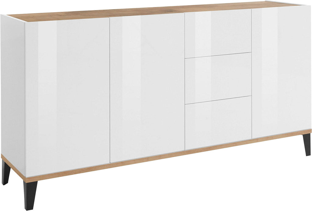 La credenza SUNRISE 3 ante + 3 cassetti da 160 cm piace per le sue dimensioni e il suo design unico e inconfondibile. Le 3 ante sono composte da 2 ripiani in legno e i 3 cassetti sono caratterizzati da guide in metallo. La credenza si appoggia su quattro piedini piramidali in plastica nera dell’altezza di 10 cm. La forma lineare la rende perfetta per qual sia si stile di arredamento.