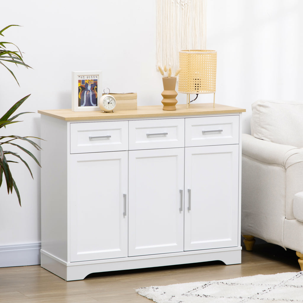 - AMPIO SPAZIO: Questa credenza da cucina dispone di tre cassetti e due armadietti a 2 livelli con tre ante per tenere gli oggetti nascosti dalla vista e al riparo dalla polvere, oltre che un piano d'appoggio per appoggiare piatti e utensili