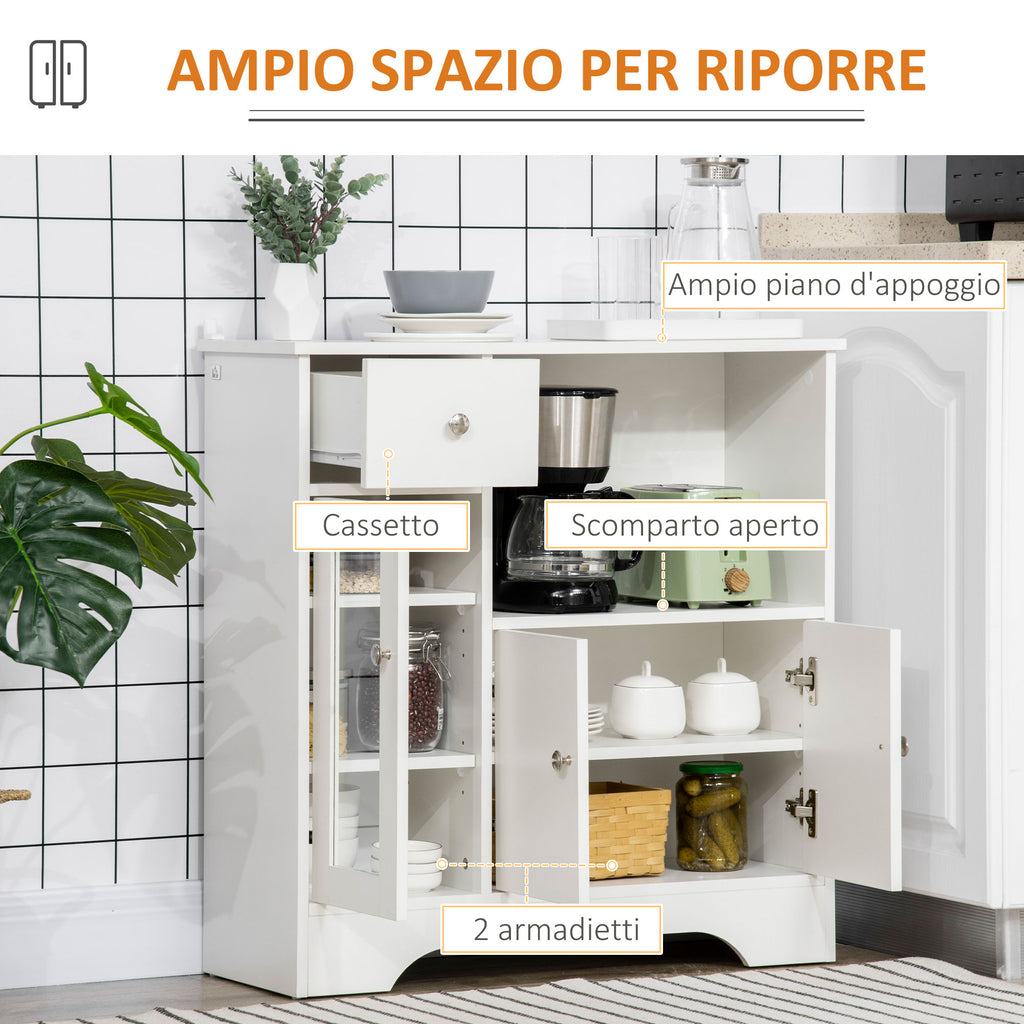Credenza Buffet 80x30x82 cm con Vano Aperto Cassetto 3 Ripiani e Armadietto a 2 Ante in Legno Bianco