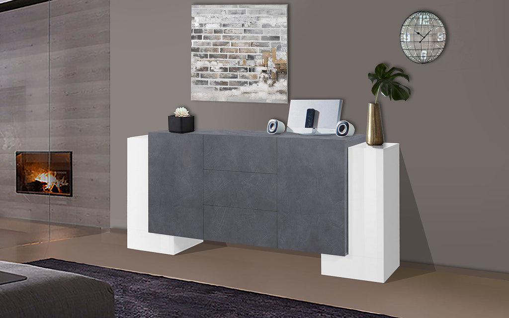 La sua ampiezza è data da 4 ante battenti più tre cassetti. La credenza PILLON da 210 cm offre generosi spazi di stoccaggio grazie alle sue 4 ante e ai 3 comodi cassetti centrali. Si caratterizza da finiture in melaminico bianco laccato lucido e report grigio. La credenza da 210 cm PILLON a 4 ante e 3 cassetti riesce a unire funzionalità e design, per rendere unico il salotto.