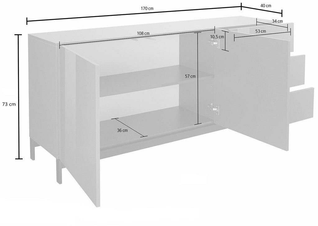 La credenza METIS è caratterizzata da una base in metallo con piedi che dona slancio alla struttura in solido legno. Il modulo di 170 cm è diviso in 2 sezioni contenitive di diversa natura: un grande vano con mensola e ante con chiusura a battente sulla sinistra, e 3 cassetti scorrevoli con pratico sistema push-to-open sulla destra.
