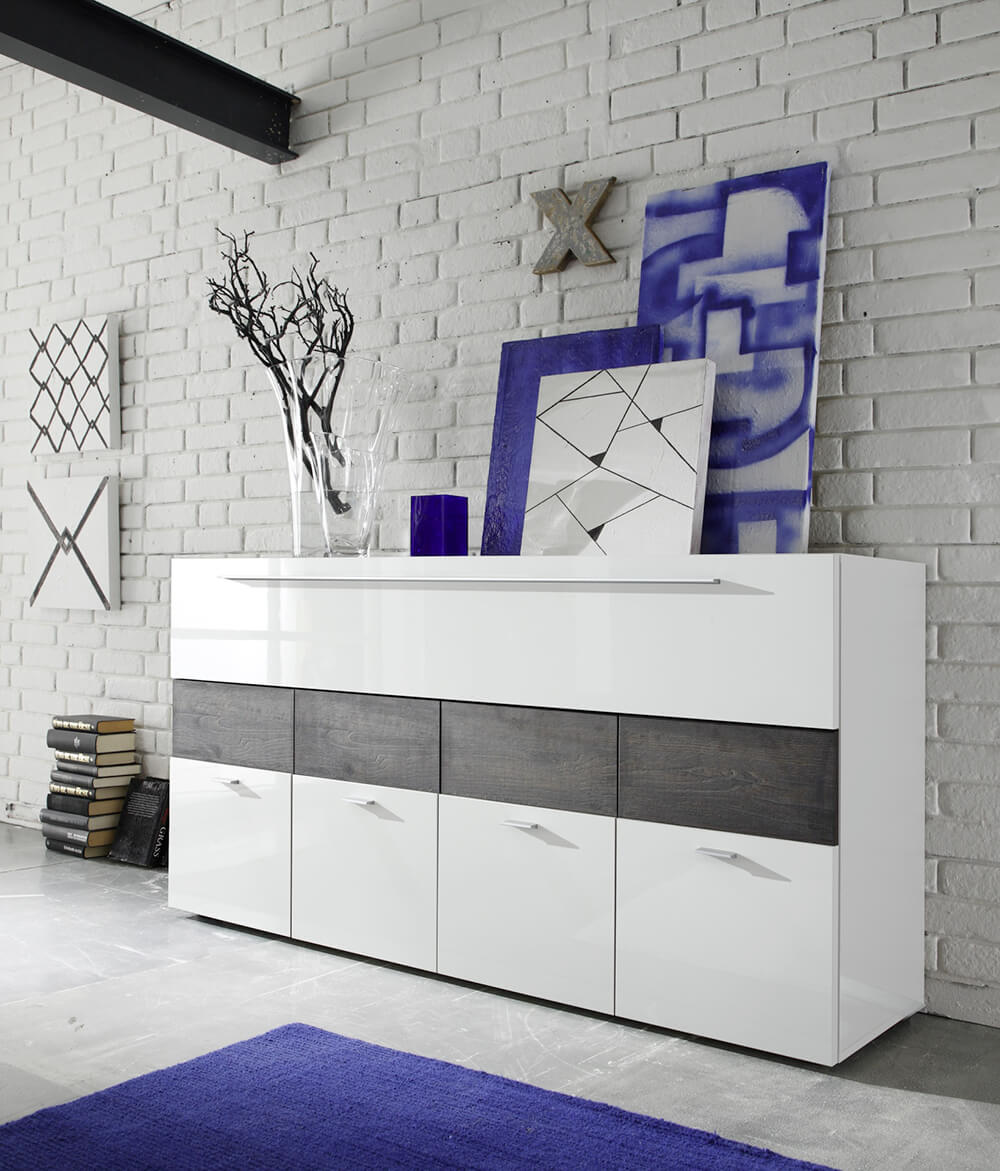 Sideboard für Wohnzimmer 4 Türen 1 Klapptür 85x161x43cm TFT Cube Glossy White und Wenge Oak