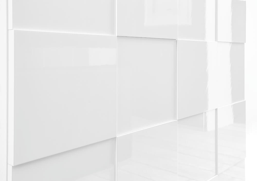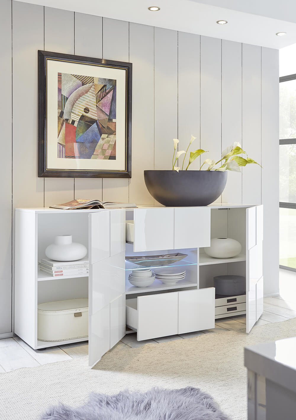 Sideboard Wohnzimmermöbel mit 2 Türen 2 Schubladen und zentraler Vitrine in Melamin 181x42x84cm TFT Karos glänzend weiß