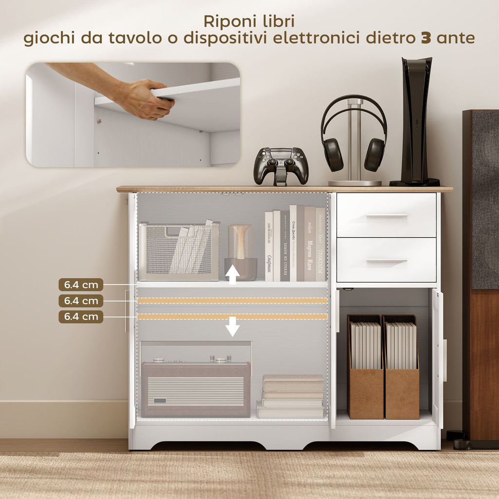 C'è troppo disordine in casa? Questa credenza moderna dotata di 2 cassetti e 3 armadietti con ripiani regolabili ti permette di riporre libri, giochi o soprammobili. Il suo design moderno color bianco e legno valorizza gli ambienti di casa, regalando una nota di eleganza minimal agli arredamenti di soggiorni, cucine, sale da pranzo e ingressi di casa.