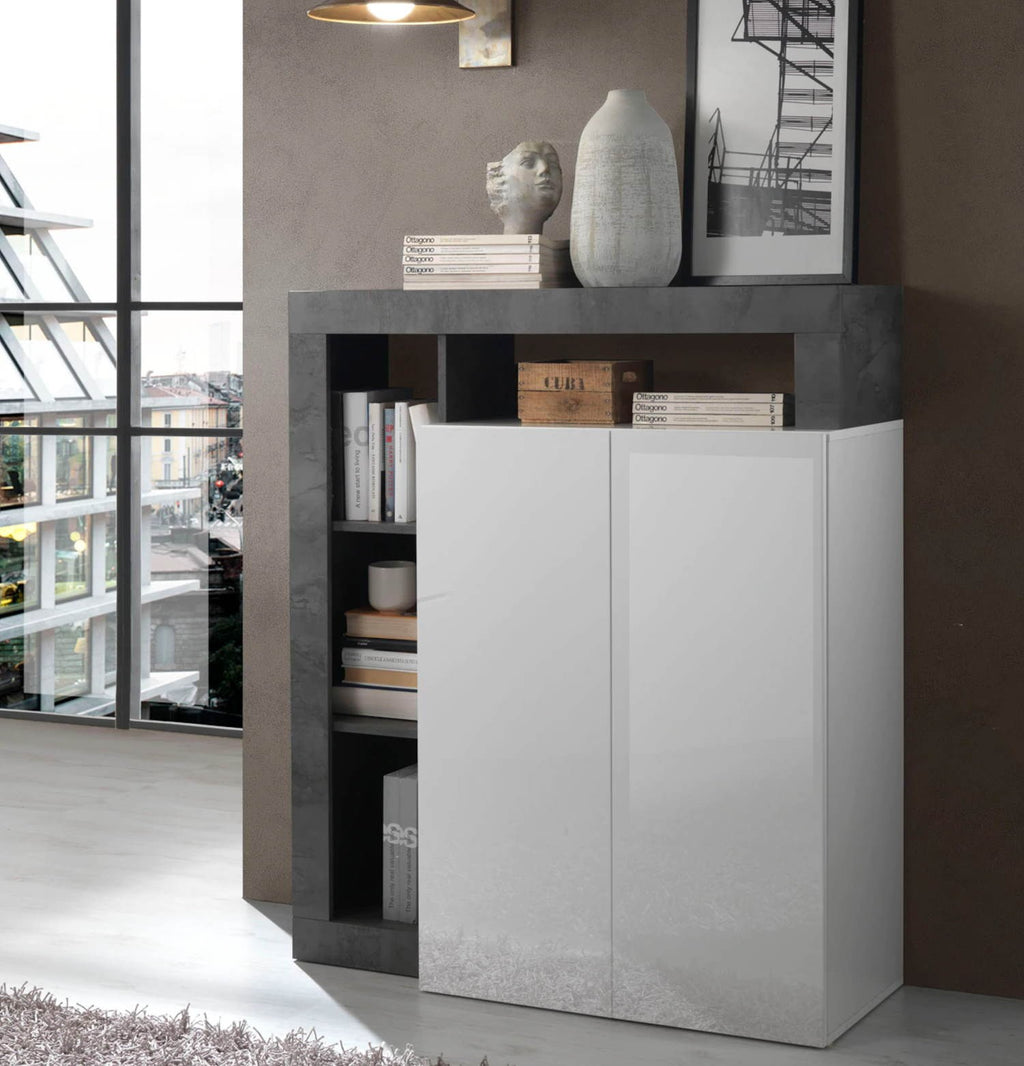 Due ante battenti con due ripiani interni, Il binomio cromatico la rende di facile abbinamento ad ambienti moderni ed eleganti.