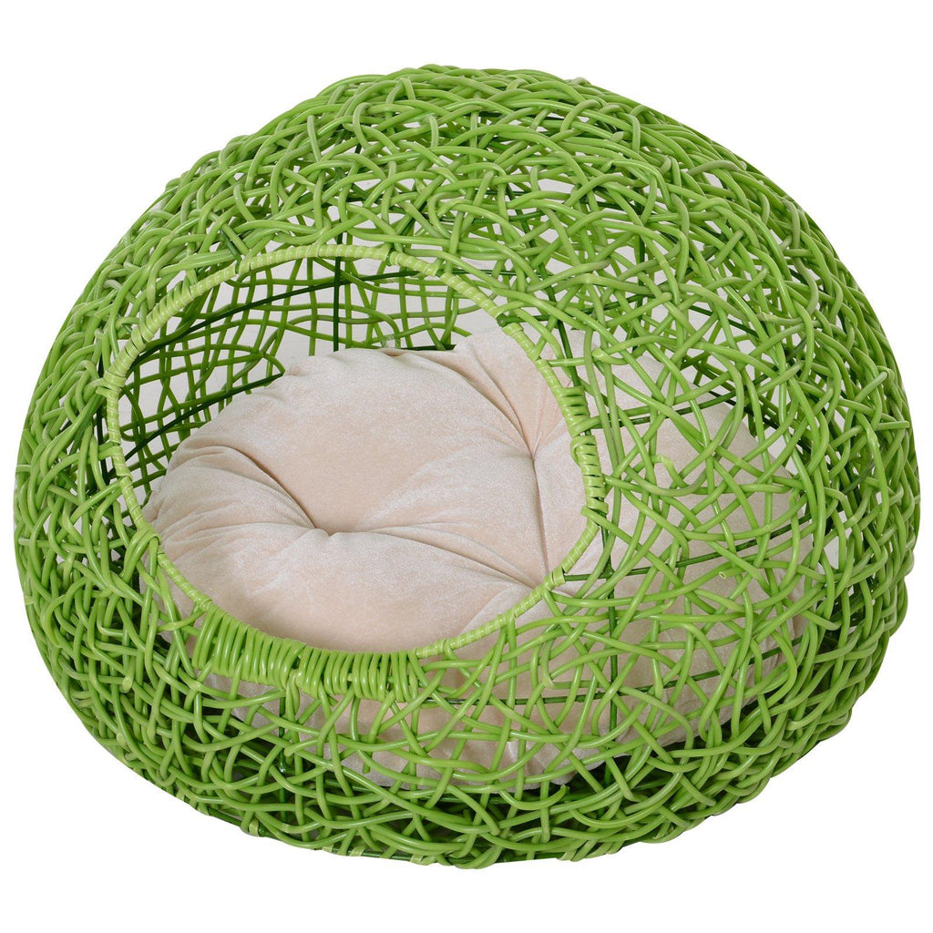 Hundehütte für Katzen in PVC-Rattan-Optik Ø56x40 cm mit grünem Kissen