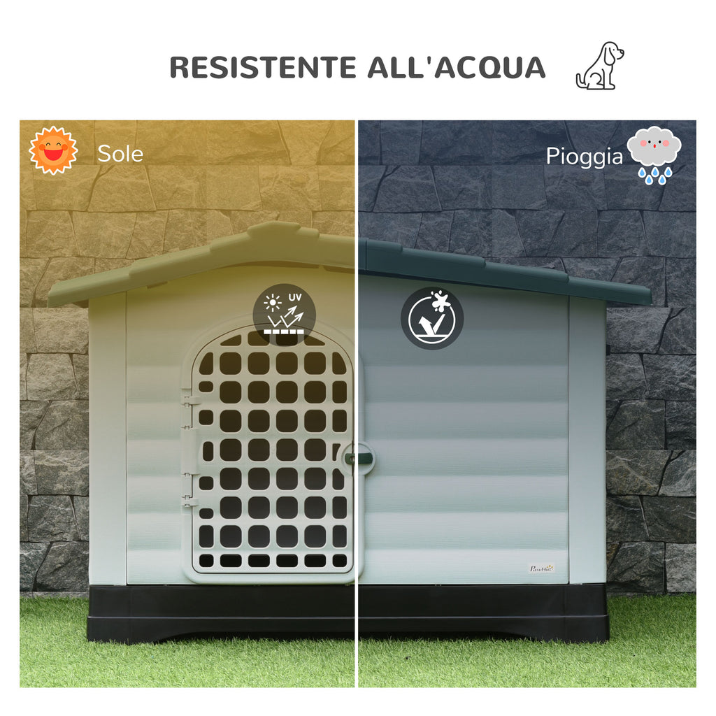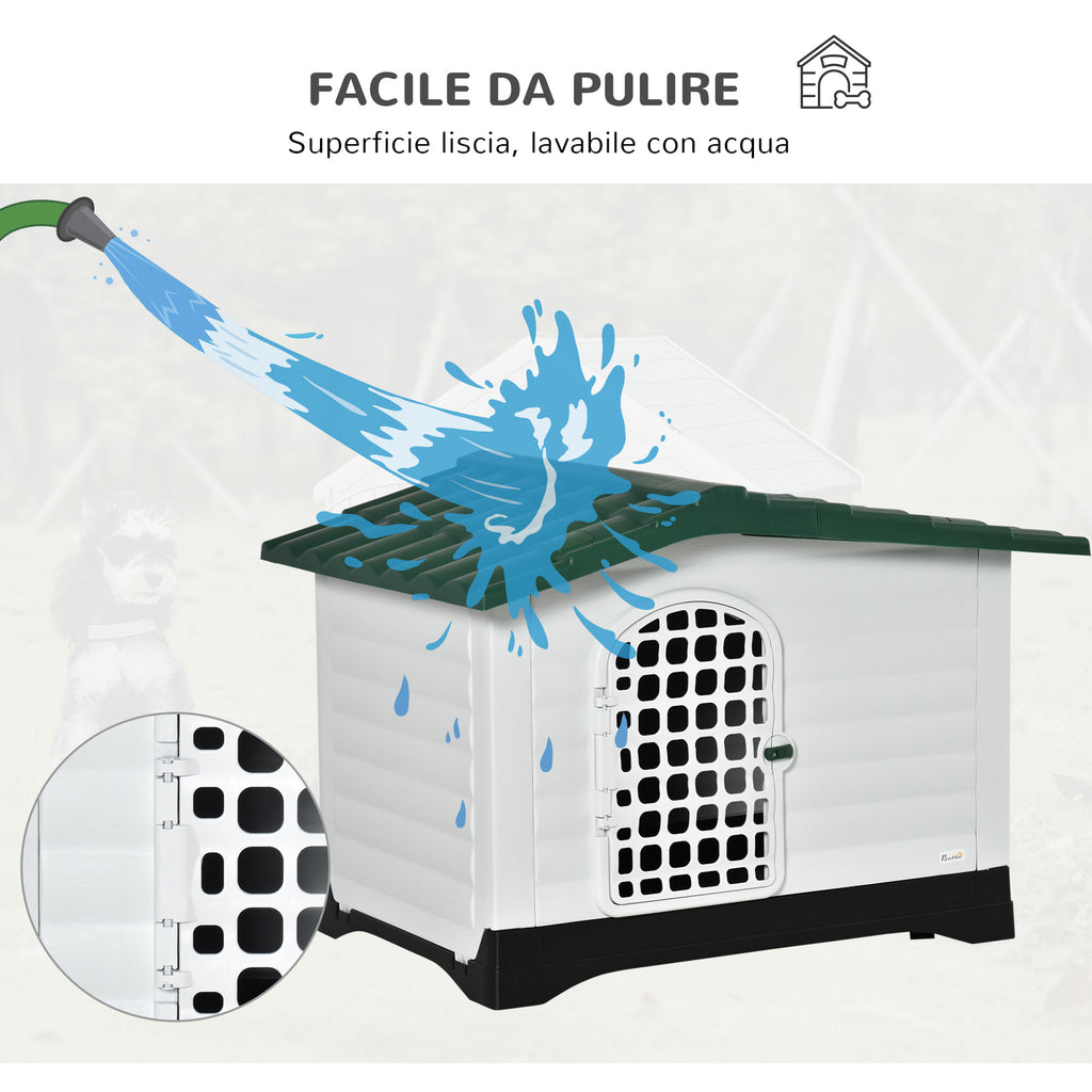 Die Hundehütte des Hauses wird zum Lieblingsplatz Ihrer 4-beinigen Freunde zum Ausruhen und Entspannen. Sie verfügt über eine Belüftungsöffnung, die geöffnet und geschlossen werden kann, zur besseren Belüftung oder zum Schutz vor Wind. Die Tür hat eine Öffnung und es gibt eine abnehmbare Seitenwand für einen leichteren Zugang. Dank der soliden PP-Struktur ist diese Hundehütte ideal für den Einsatz im Freien.